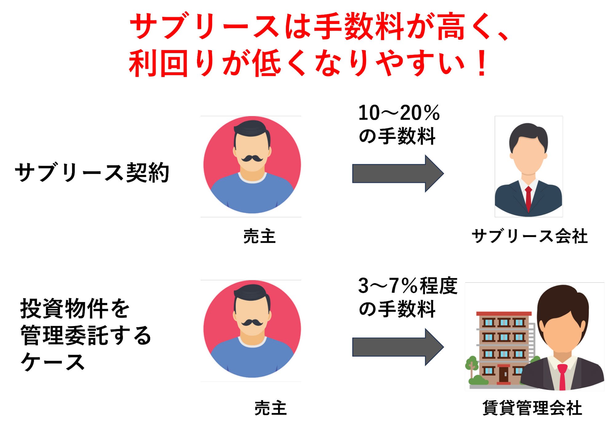 一般管理手数料は3〜7%ですが、サブリース物件では20%になるものもあり、手数料の分だけ収益性が下がります。