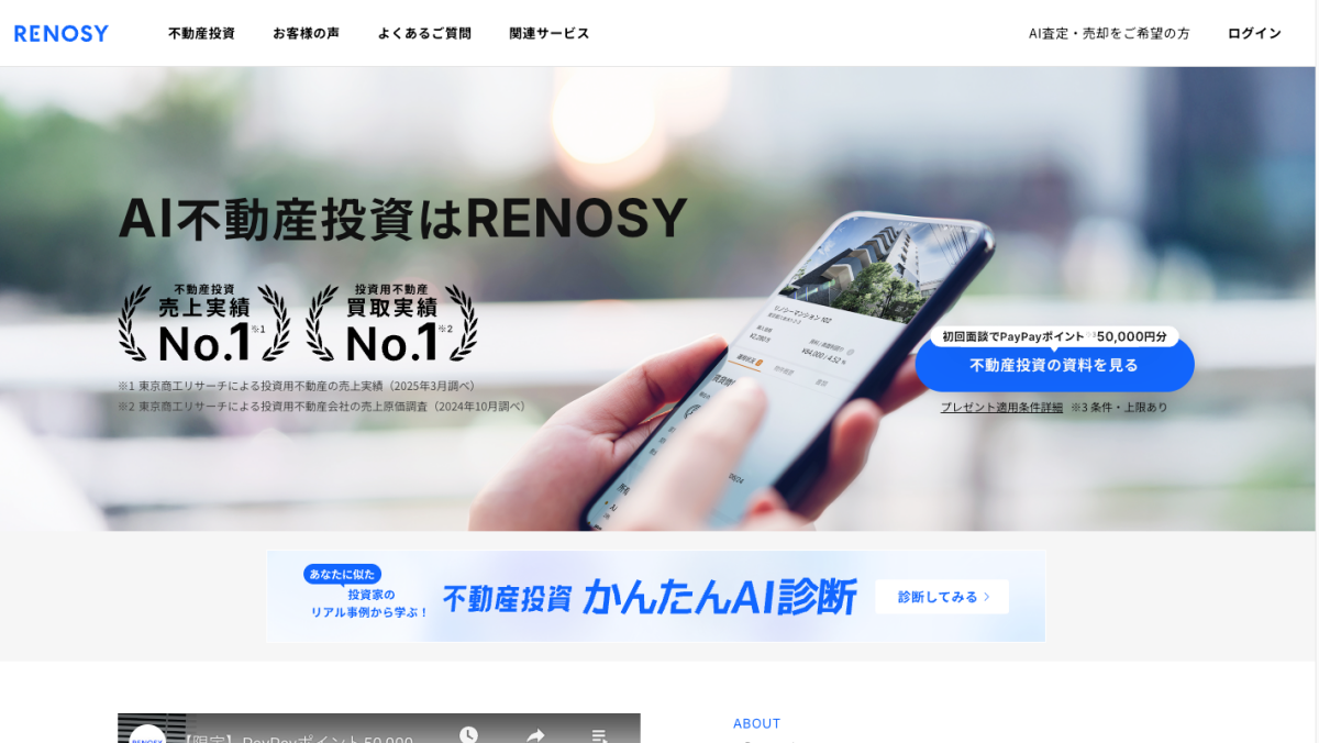 物件購入しました。大阪2件、福岡4件です。最初は広告を見て、話聞くだけでPayPayポイントもらえるラッキーって感じで申し込みましたが、担当の営業さんが不動産だけでなく税務もめちゃくちゃ詳しくて、かつ手続きも早いし全部オンライン&郵送で完結するし、忙しい人間には最高でした。これまで購入した不動産の会社で1番優秀だと思います。人と仕組みは完璧なので、後は買った物件が期待通りのパフォーマンス出してくれれば◎